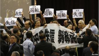 Agencies reported that as Mr Li approached the lectern, several lawmakers and demonstrators stood up with placards and a banner, chanting: "The central government broke its promise, shameless." They were eventually escorted out by security guards.
